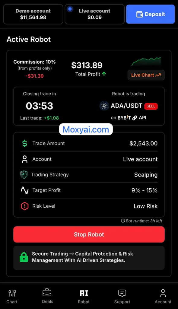 MoxyAI offers several features that enhance user trust and operational efficiency. The invested capital is always returned after each trade, with the company charging a 10% fee only on the profits earned by the AI. The platform supports both demo accounts for practice and live accounts for real trading. Depositing funds into a live account activates the AI robot to trade with actual money, generating real profits.